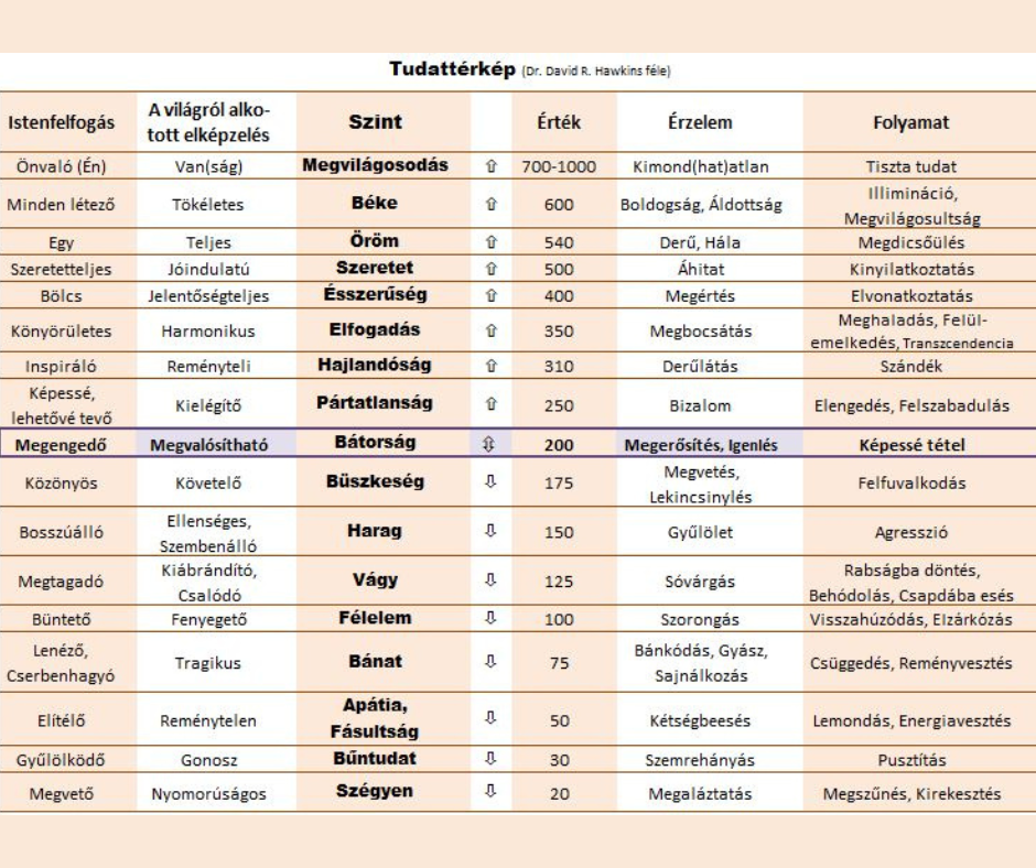 Ez a folyamat tökéletesen illeszkedik a képen is látható Dr. David R. Hawkins érzelmi–tudatossági skálájához: